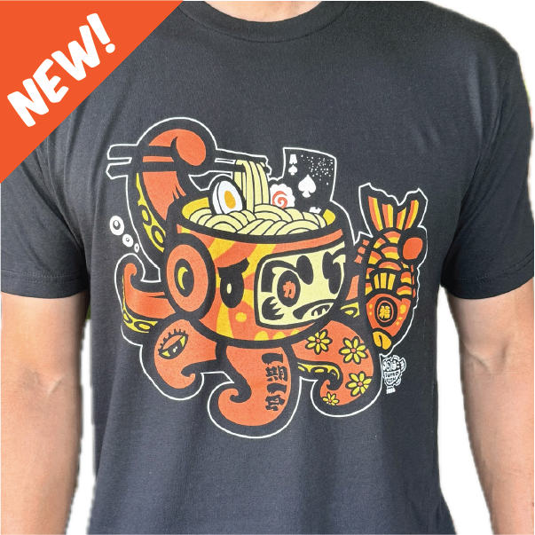 Graphic and whimsical octopus-daruma ramen bowl holds a lucky tai sea-bream.